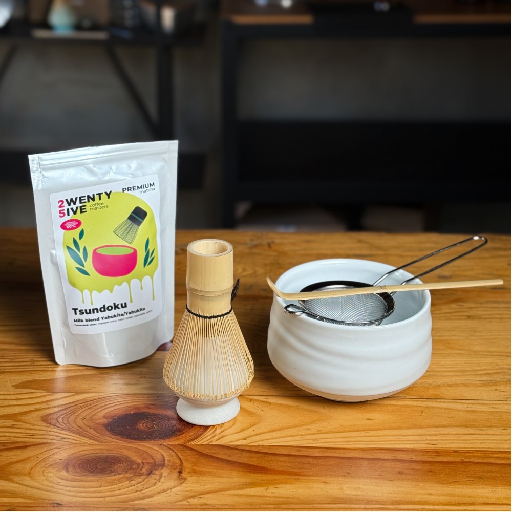 Chawan (tea bowl) — a white 550 ml bowl made specifically for preparing and drinking matcha. Its shape is designed for a comfortable grip and precise, effortless whisking.